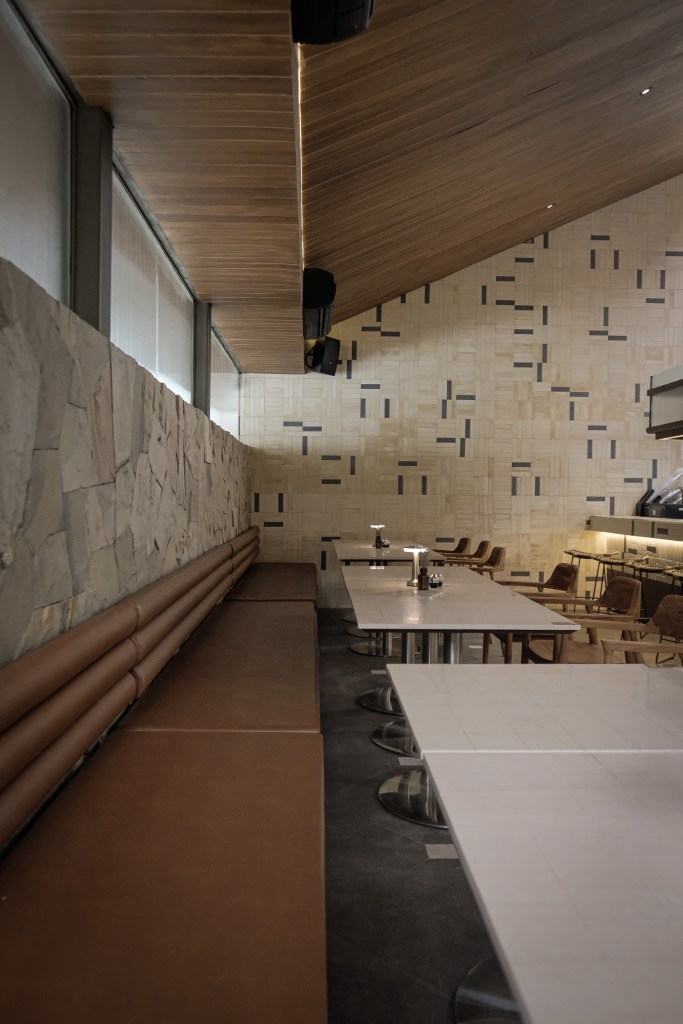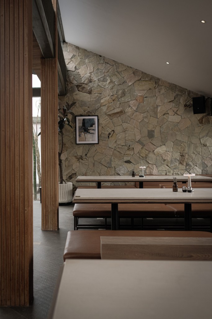 Natural color tones and materials are vividly seen in the architecture and interior. Natural stone, ceramic tile, and wood dominate the materials of both the interior and architectural design. Other materials such as glass in the bar area are giving an elegant accent, making this restaurant feel lavish but still humble.