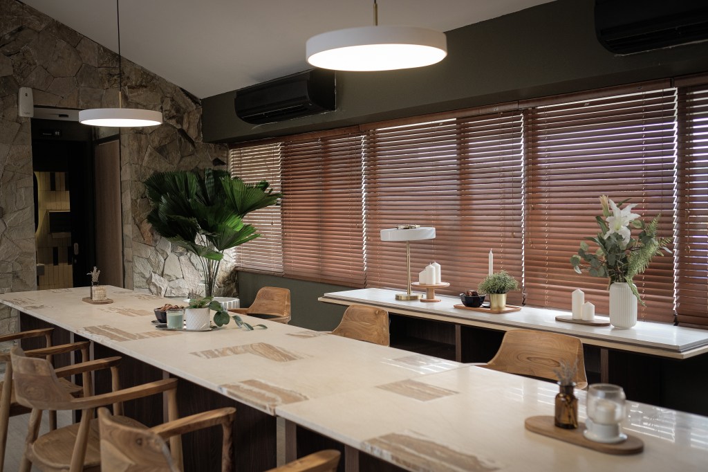 ‘We want to make a cozy but chic family restaurant. To make the room has a lavish ambiance, we made the ceiling high. But the use of natural color tones and materials made the room still feel humble like when we are in a family gathering; not pretentious, cozy, and soulful,’ explained Patricia Harwig, the founder of Atelier MEJA.
