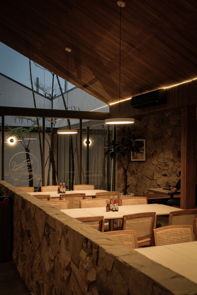 Atelier MEJA, a Bandung-based architecture and design studio, designed the newest family restaurant Justus Steakhouse in Alam Sutera, Tangerang. The project is a new building project which Atelier MEJA designed from the architecture to the interior and it finished in early 2023. The restaurant itself opened in the last week of February 2023.