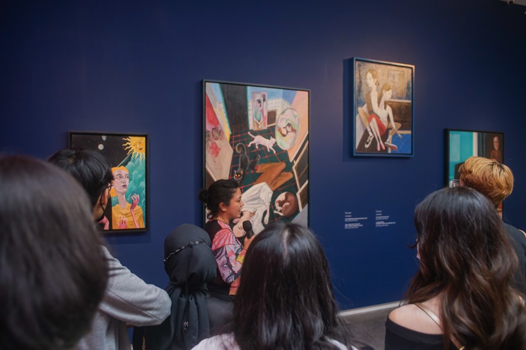 Zarani Risjad memulai tur dengan menyampaikan tema pameran dan apa yang mendasarinya memilih judul tersebut. Seperti yang sudah disebutkan di awal, judul pameran ini terinspirasi dari ungkapan “a picture is worth a thousand words (sebuah gambar bernilai ribuan kata)” di mana sebuah gambar bisa menyampaikan perasaan-perasaan yang kompleks, ide, dan pengalaman-pengalaman yang sulit diungkapkan oleh kata-kata (Zarani Risjad, 2023). Enam seniman menyampaikan cerita mereka melalui karya seni kontemporer yang mereka buat. Cerita-cerita yang disampaikan mencakup cerita pengalaman pribadi mereka, cerita yang mereka dapat dari pengalaman orang dan komunitas di sekitar mereka, sampai karya yang merespon beberapa cerita fiksi yang memiliki isu atau masalah menarik untuk diangkat.
