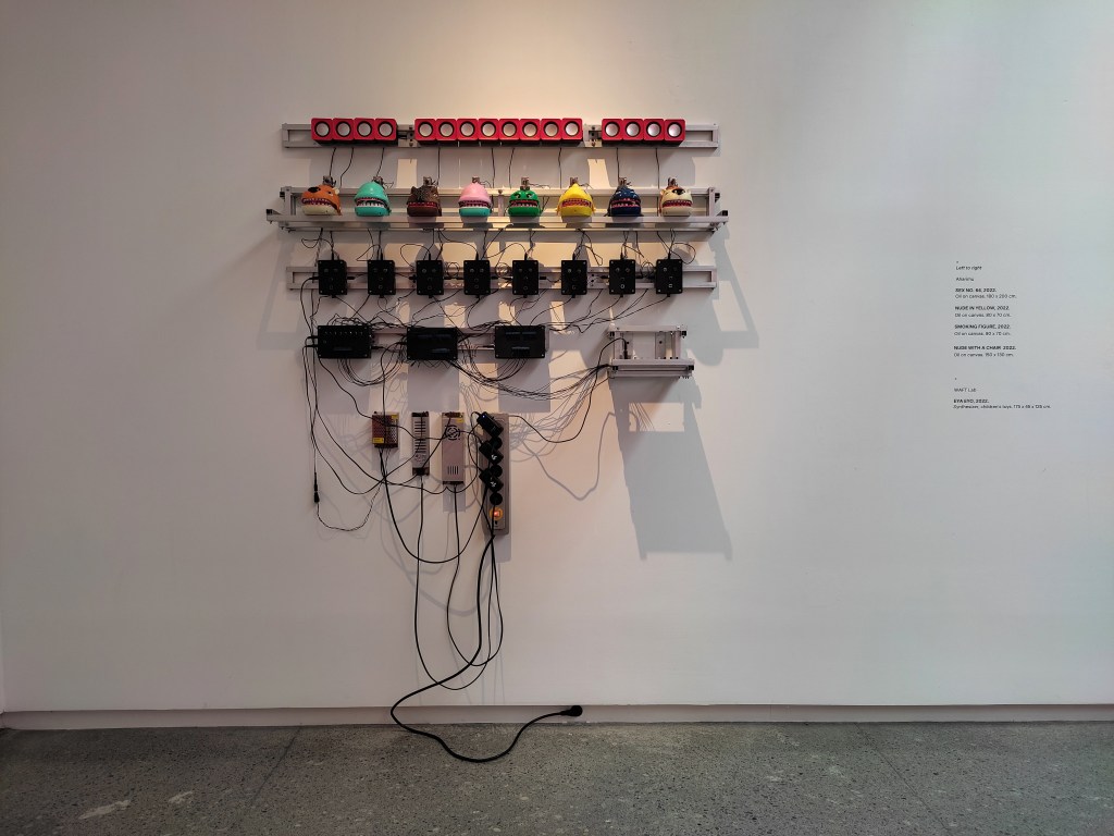 Pada karya Eya Eyo, WAFT Lab menggunakan mainan anak-anak dan di setiap mainan anak-anak yang dipajang tersimpan suara yang direkam (recorded sound) para seniman sendiri yang berbunyi eya-eyo, rekaman suara penjual roti, dan lain-lain.