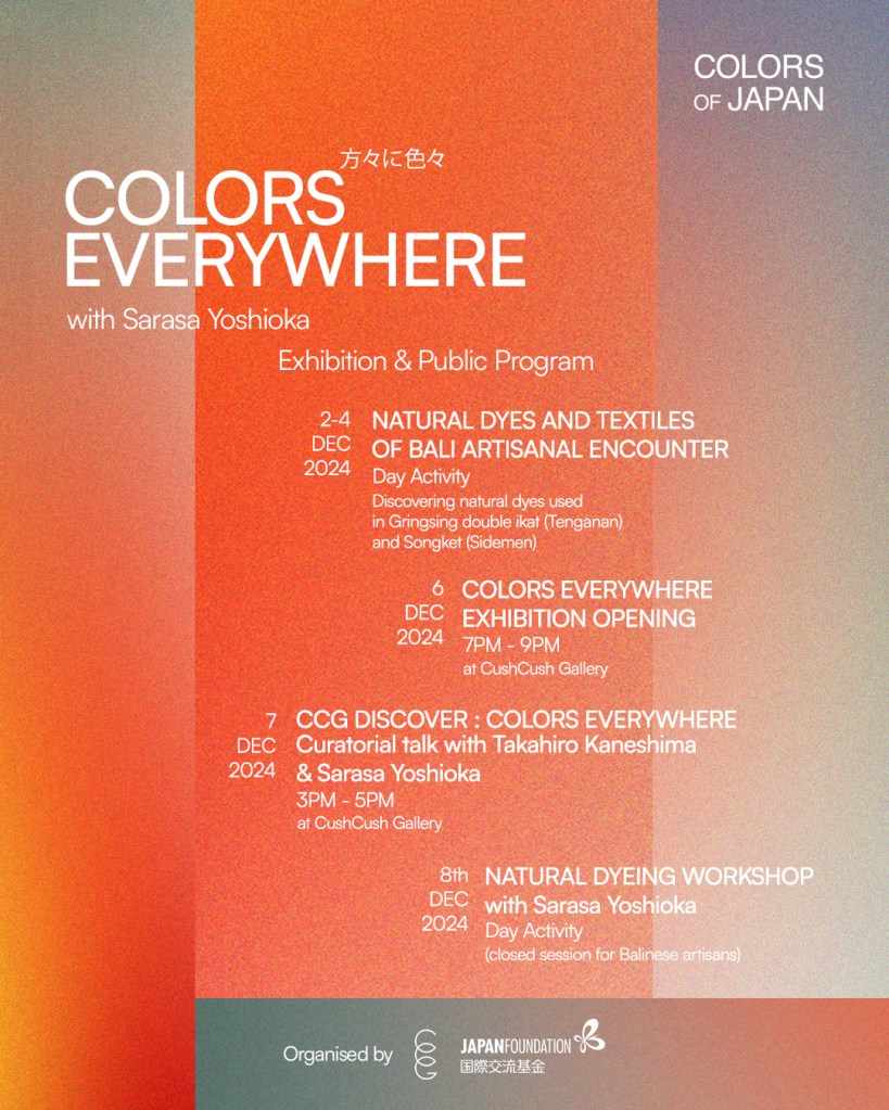 Diko-kuratori CCG bersama peneliti seni Jepang Takahiro Kaneshima, pameran “Colors Everywhere” akan memamerkan karya menawan Sarasa Yoshioka sebagai master dyer, serta beberapa seleksi tekstil Indonesia dan India dari koleksi pribadi studionya. Pameran ini akan menyoroti peran warna dalam suatu budaya dan bagaimana warna dapat melampaui batas dan menghubungkan orang-orang dari berbagai belahan dunia. Pameran ini akan berlangsung di CCG mulai 7 Desember 2024 hingga 12 Januari 2025, untuk kemudian juga dipamerkan di Japan Foundation di Jakarta mulai 24 Januari hingga 7 Februari 2025.