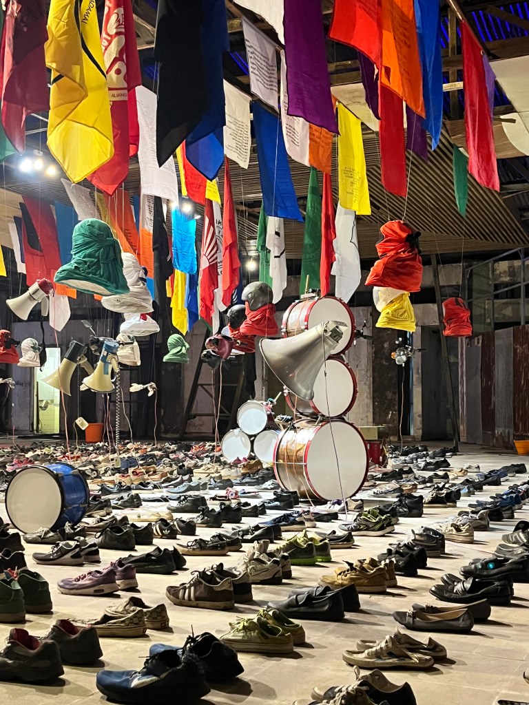 Jompet Kuswidananto: For “ARAK-ARAK”, in many of my works, I envision the journey of Indonesian history as a march—a crowd walking together that, at certain points, jostles, competes, and touches; some fall, some arrive first, all seemingly jostling to be remembered. “Midnight Haze and The Drifting Flocks”, on the other hand, takes a poetic approach, describing the past as a fog that is sometimes visible and sometimes not. Within this fog, things appear with varying clarity, sometimes sharply defined, sometimes indistinct, akin to a ghost or a shadow. It’s a poetic approach to understanding history (and even reality) in a nuanced, rather than simply vague, way.