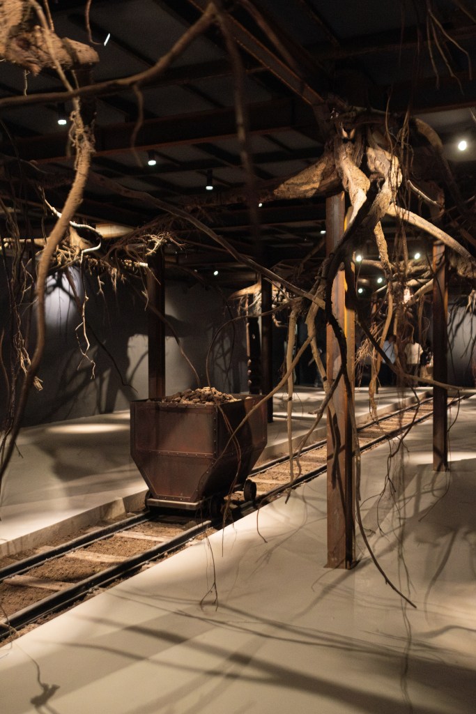 Pencahayaan redup yang terfokus pada karya seni menciptakan ruang transisi, seolah secara mental saya sedang di-reset dan dipersiapkan untuk karya-karya selanjutnya. Akar-akar pohon besar yang menjuntai dari langit-langit, instalasi rel dan totem-totem kayu, serta suasana muram di area ini menarik saya masuk ke dalam sebuah gua di bawah tanah.