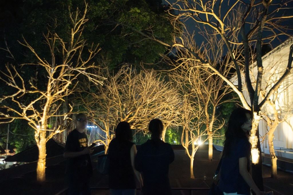 Kontras perspektif terasa saat saya melangkah ke lantai atas. Pohon-pohon yang akarnya tadi menjuntai di atas kepala kini berdiri sejajar dengan pandangan saya. Terlebih, di waktu malam, sorotan lampu instalasi pada batang dan ranting pohon yang ranggas menciptakan jukstaposisi visual yang menarik dengan rimbunnya pepohonan di latar belakang.