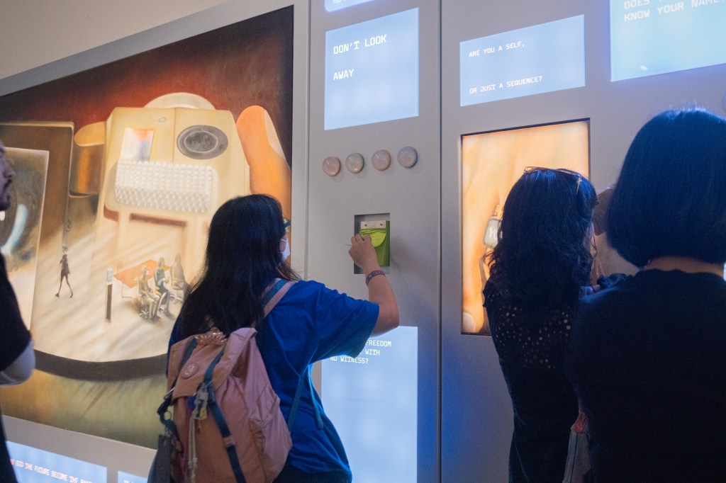 Kata-kata dalam karya Syagini Ratna Wulan atau Cagi, The Labyrinth I Become, cukup menggelitik. Cagi menempatkan relasi antara imaji dan mata sebagai objek kontemplasi. Ia menyoroti fenomena Homo digitalis—manusia yang berinteraksi atau bertindak di dunia maya—kini mengalami dekorporealisasi, banalisasi, dan disembodiment of the self. Ini terjadi ketika, dengan hanya menggerakkan jempol, mereka bertindak secara seketika atau refleks, merasa eksis sebagai pengelana global yang mengambang dalam dunia internet tahap lanjut. Setiap kali melewati karya ini, saya melihat banyak orang memotret kata-kata tersebut.