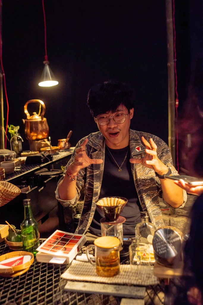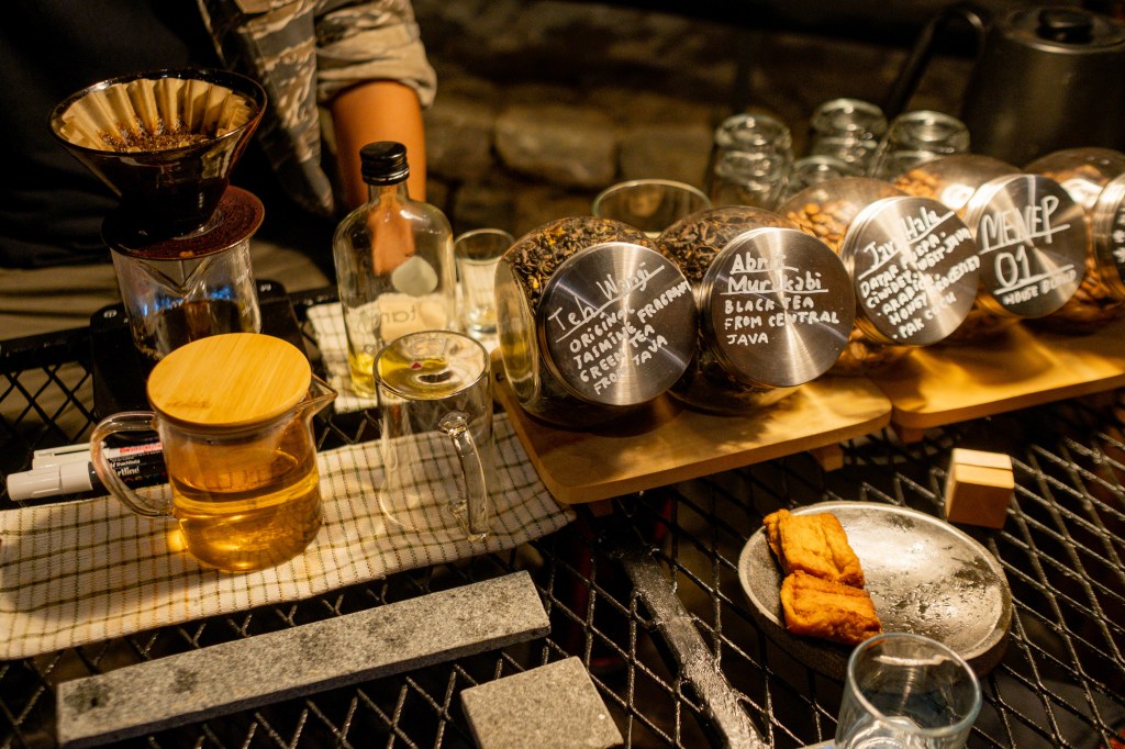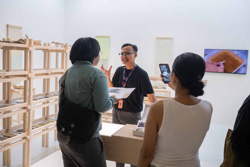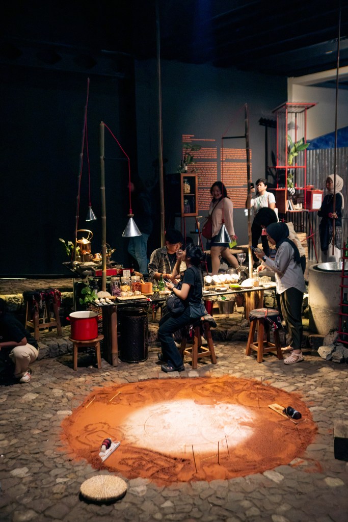 “Secara umum, judulnya memang Tanah Air Beta. Kami sebagai kolektif menyoroti bagaimana orang Indonesia menghargai budaya dan lokalitas mereka. Seringkali kita merasa atau mendengar bahwa sesuatu dari luar atau Barat itu lebih baik, lebih sehat, lebih bagus, lebih suci. Mengapa kita tidak menjadi—kalau istilah Gen Z—alfa, justru hanya berhenti di proses beta saja? Kami ingin mengajak orang untuk melihat kembali budaya lokal. Ambil contoh trasah batu ini: ia tidak menggunakan semen dan bisa menyerap air, cukup bermain kunci-kuncian saja. Ini lebih baik daripada aspal karena pembakaran aspal menghasilkan emisi karbon tinggi, sedangkan ini tidak. Ia juga bisa menyerap air melalui rongga-rongganya. Dengan begitu banyak kebaikannya, mengapa kita tidak menggunakannya sebagai jalan yang kita kenal sekarang? Instalasi ini adalah perayaan air dan tanah, sehingga obrolan-obrolan seperti inilah yang ingin kami munculkan, juga perayaan lokalitas dan penggalian ulang nilai-nilai yang pernah ada. Kita harus kritis melihat modernisme, jangan sampai karena modernisme kita bukannya berevolusi malah berdevolusi,” ungkap salah satu anggota Murakabi Movement sambil menyajikan teh wangi di meja bar di instalasi interaktif mereka.