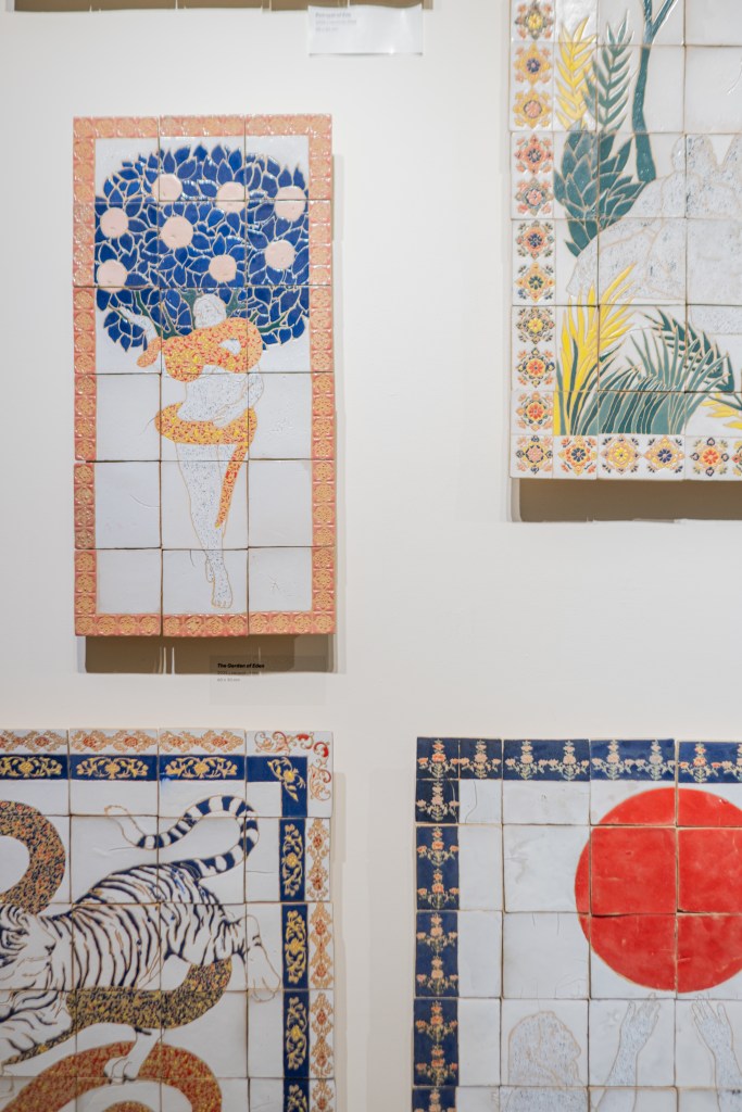 Karya Zuraisa, Trace of Eve’s Good Deeds, berhasil menahan perhatian saya. Ketertarikan pribadi saya pada keramik, khususnya ubin keramik dekoratif, membuat saya mengapresiasinya lebih dalam. Karya ini menampilkan sosok perempuan dengan bentuk tubuh yang kerap dianggap kurang ideal oleh masyarakat. Secara kontras, mereka didampingi figur-figur binatang—harimau dan ular—menghadirkan metafora akan sisi maskulinitas yang tak dipertentangkan secara biner.