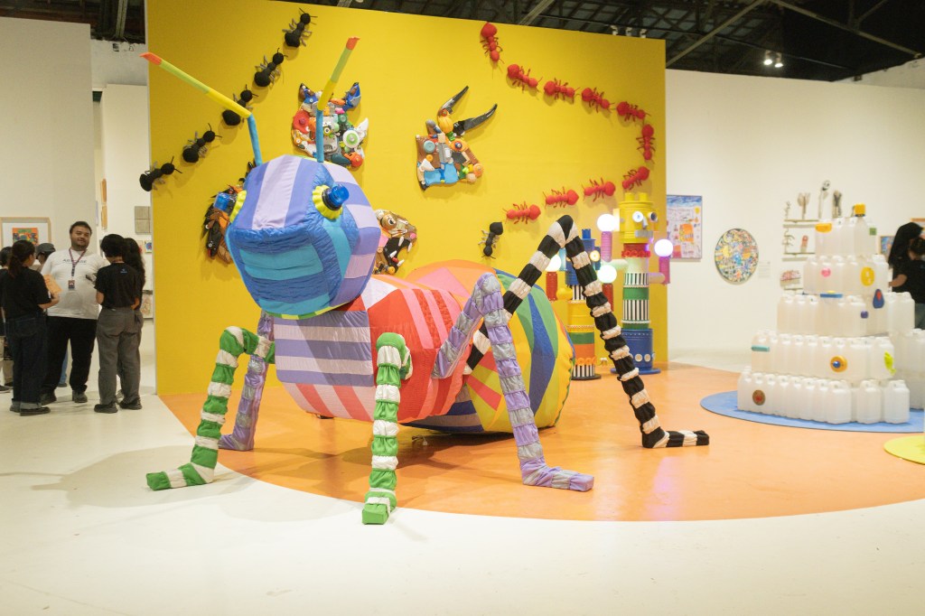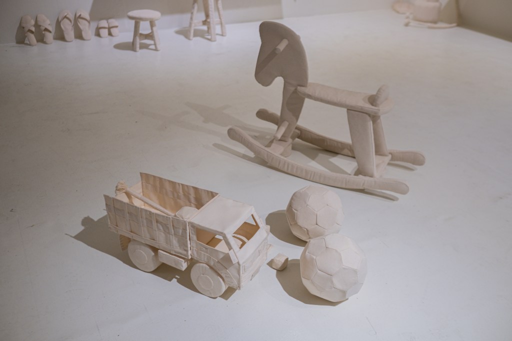 Di dekat karya Zuraisa, sebuah instalasi serba putih dari lantai hingga plafon menarik perhatian saya. Itu adalah Rupa Tan Matra karya Veronica Liana, salah satu pemenang Young Artist Award (YAA) 2025. Karya ini mencuri perhatian saya sesederhana karena menggunakan jenis material dan warna yang sama untuk membentuk tiruan benda-benda sehari-hari. Setelah membaca lebih jauh, saya mengamini pesan yang ingin disampaikan seniman.