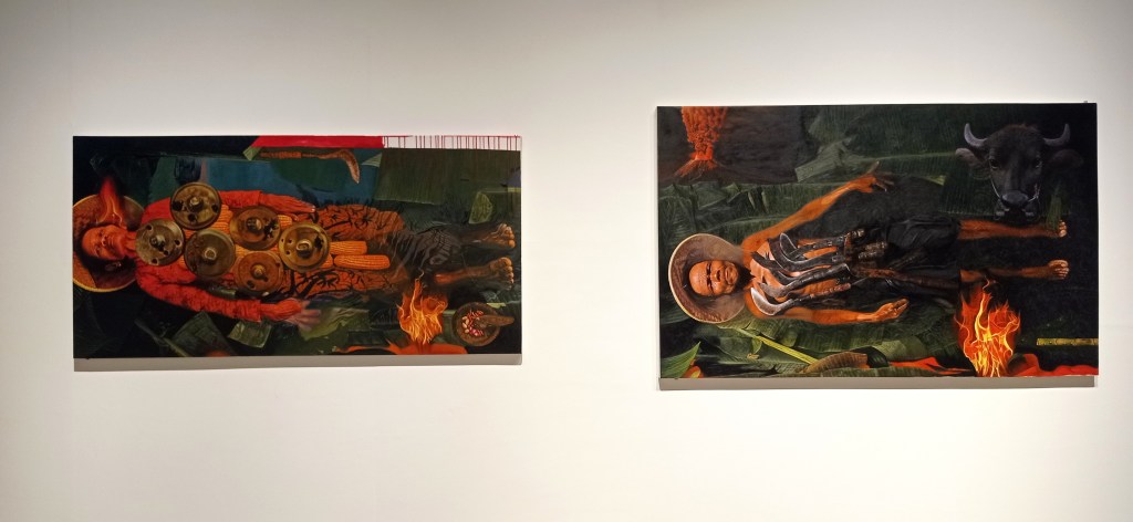 Beberapa karya di pameran ini memperkuat perspektif tersebut. Kedua karya Moelyono, Gamelan Mengapung di Ladang Jagung dan Arit Mengapung di Ladang Tebu, misalnya, dapat dibaca sebagai medan interaksi dinamis antara manusia, objek, dan lanskap agraris. Pendekatan ini selaras dengan gagasan Bennett (2010) mengenai vibrant matter yang melihat material bukan sebagai alat pasif, melainkan entitas aktif yang membentuk realitas sosial-politik. Dalam Gamelan Mengapung di Ladang Jagung, tubuh petani, jagung, dan instrumen gamelan membentuk jejaring material yang saling mengafeksi—suara gamelan membangun resonansi kultural yang melekat pada siklus pertanian, sementara jagung mengembalikan narasi kerja kolektif yang terancam homogenisasi industrial. Sementara itu, Arit Mengapung di Ladang Tebu menempatkan arit—simbol kerja dan perjuangan kelas—sejajar dengan tubuh petani, api, tebu dan kerbau, membentuk ekologi material yang setara.