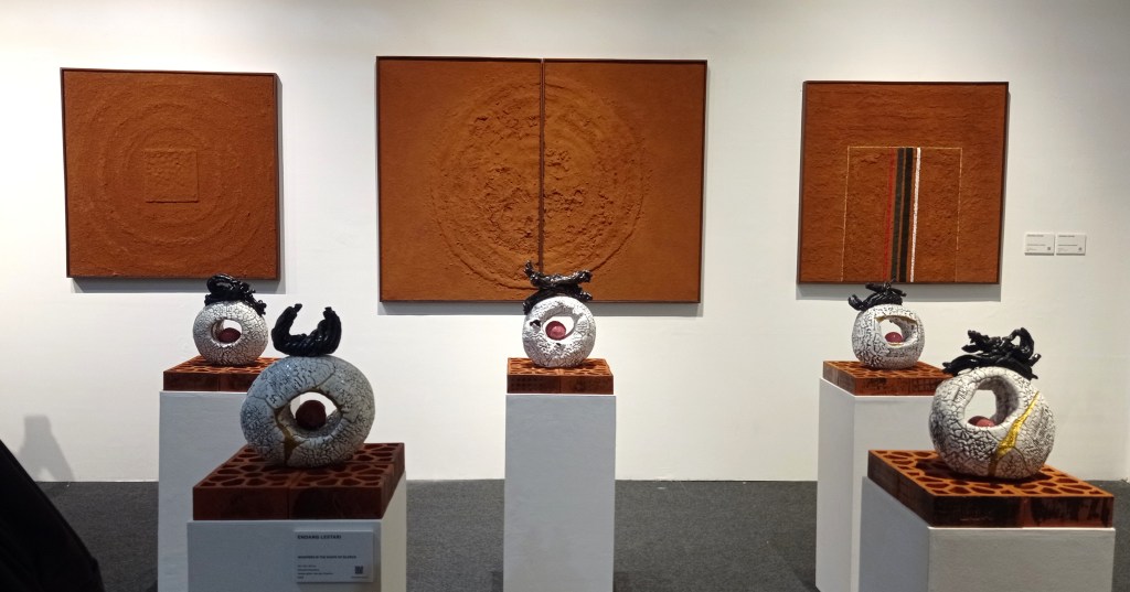 Karya Sediment of The Soul karya Endang Lestari bergerak dalam kerangka serupa. Material tanah liat, dengan warna merah bata dan teksturnya, menjadi aktor aktif yang menyimpan sejarah geologis dan memori kolektif. Perspektif ini sejalan dengan Bolt (2013) yang menekankan kekuatan performatif citra dan objek. Retakan pada keramik mengisyaratkan proses fisik—panas, tekanan, pendinginan—yang menjadi narasi material itu sendiri, membentuk dialog antara kekuatan alam dan intervensi manusia. Dalam kerangka New Materialism (Coole & Frost, 2010), karya ini menggugat dikotomi roh–benda, menegaskan bahwa “jiwa” tidak berada di luar materi, melainkan termaterialisasi melalui interaksi tanah, api, dan bentuk.